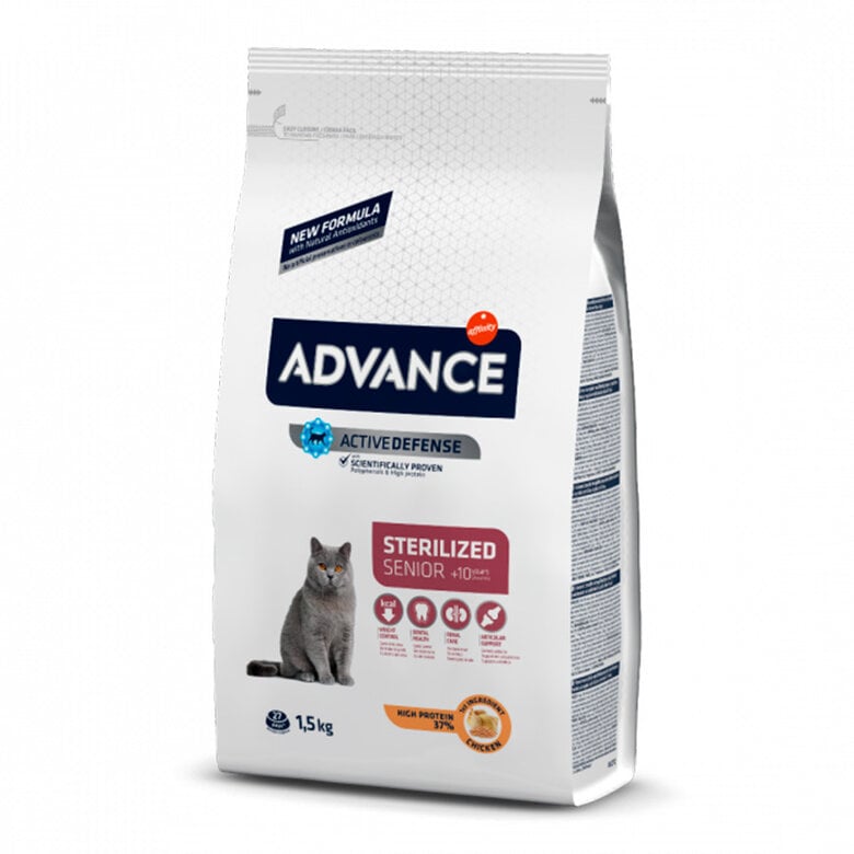 Alimento de alta gama compuesto especialmente para gatos esterilizados de más de 10 años ya que contiene elementos saciantes y ayuda al mantenimiento de la masa muscular. El pienso para gatos Advance Sterilised es perfecto para aquellos gatos mayores de 10 años que han sido esterilizados, ya que ayuda a que tu mascota mantenga unas buenas articulaciones, buen funcionamiento del cartílago y una correcta actividad cognitiva. Los gatos mayores son muy propensos a sufrir problemas urinarios y de riñón, el pienso para gatos esterilizados mayores Advance Feline Sterilized cuenta con un nivel bajo de fósforo y un pH óptimo que garantizan un funcionamineto correcto del riñón y del tracto urinario.